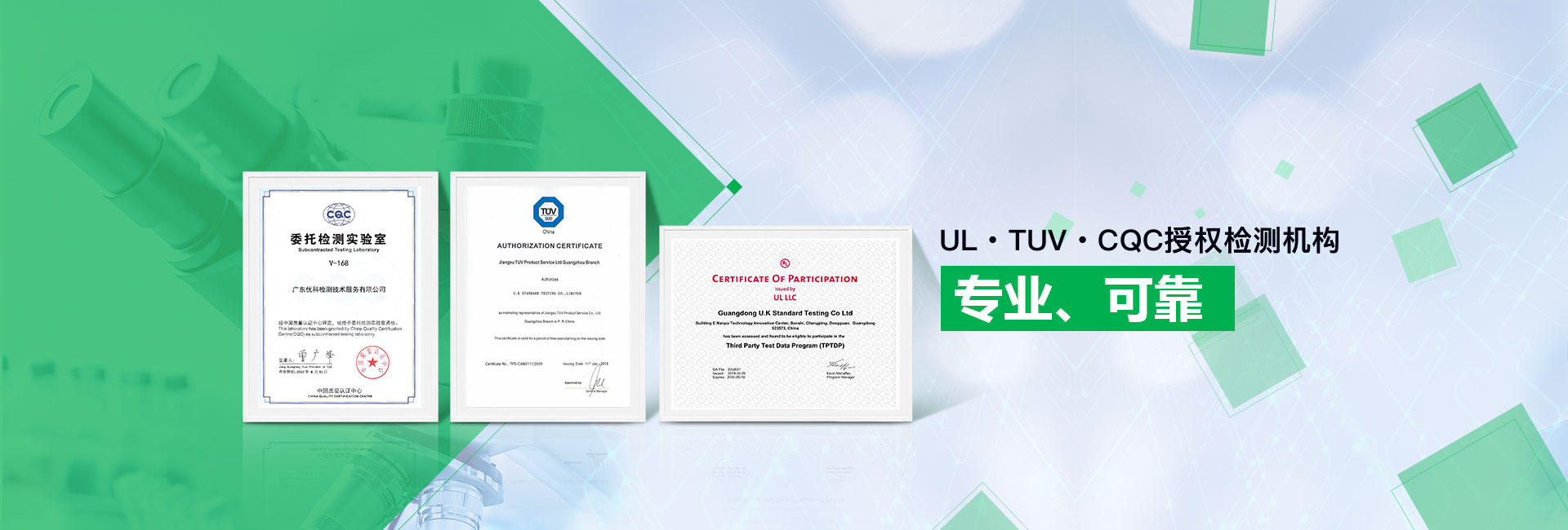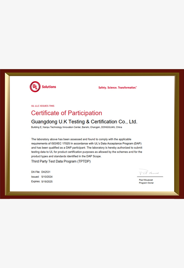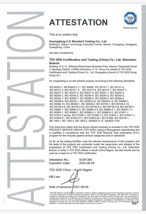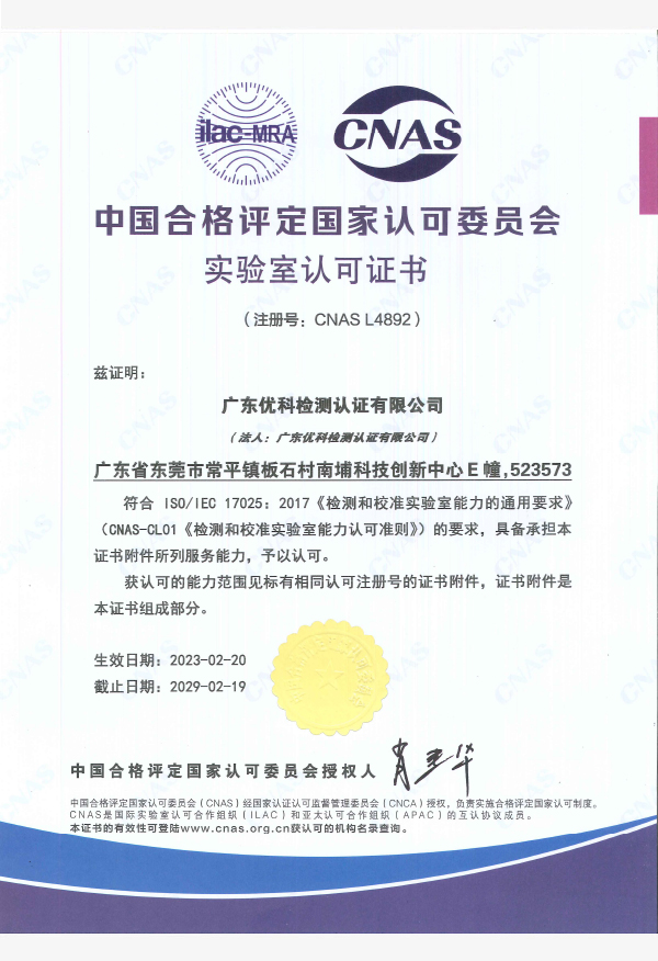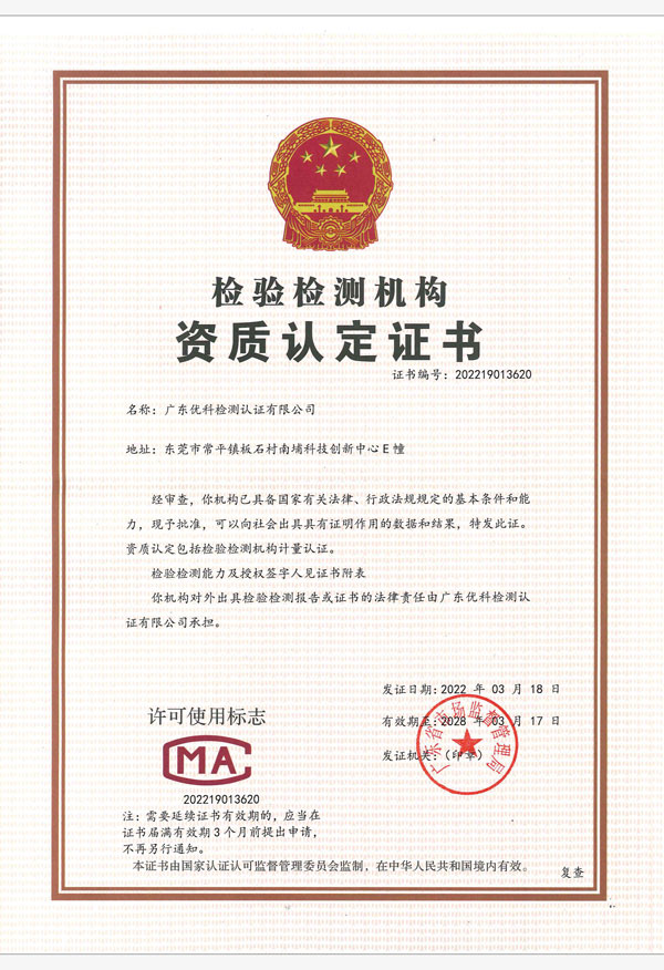 廣東優(yōu)科檢測認(rèn)證有限公司(簡稱:UKK)成?于2007年,是國內(nèi)專業(yè)的汽車整車及零部件、電子元器件第三方檢測實驗室,國家級中小企業(yè)公共(技術(shù))服務(wù)示范平臺,獲得了國家?新技術(shù)企業(yè)、廣東省專精特新中小企業(yè)、市級工程技術(shù)研發(fā)中心等榮譽稱號。 More